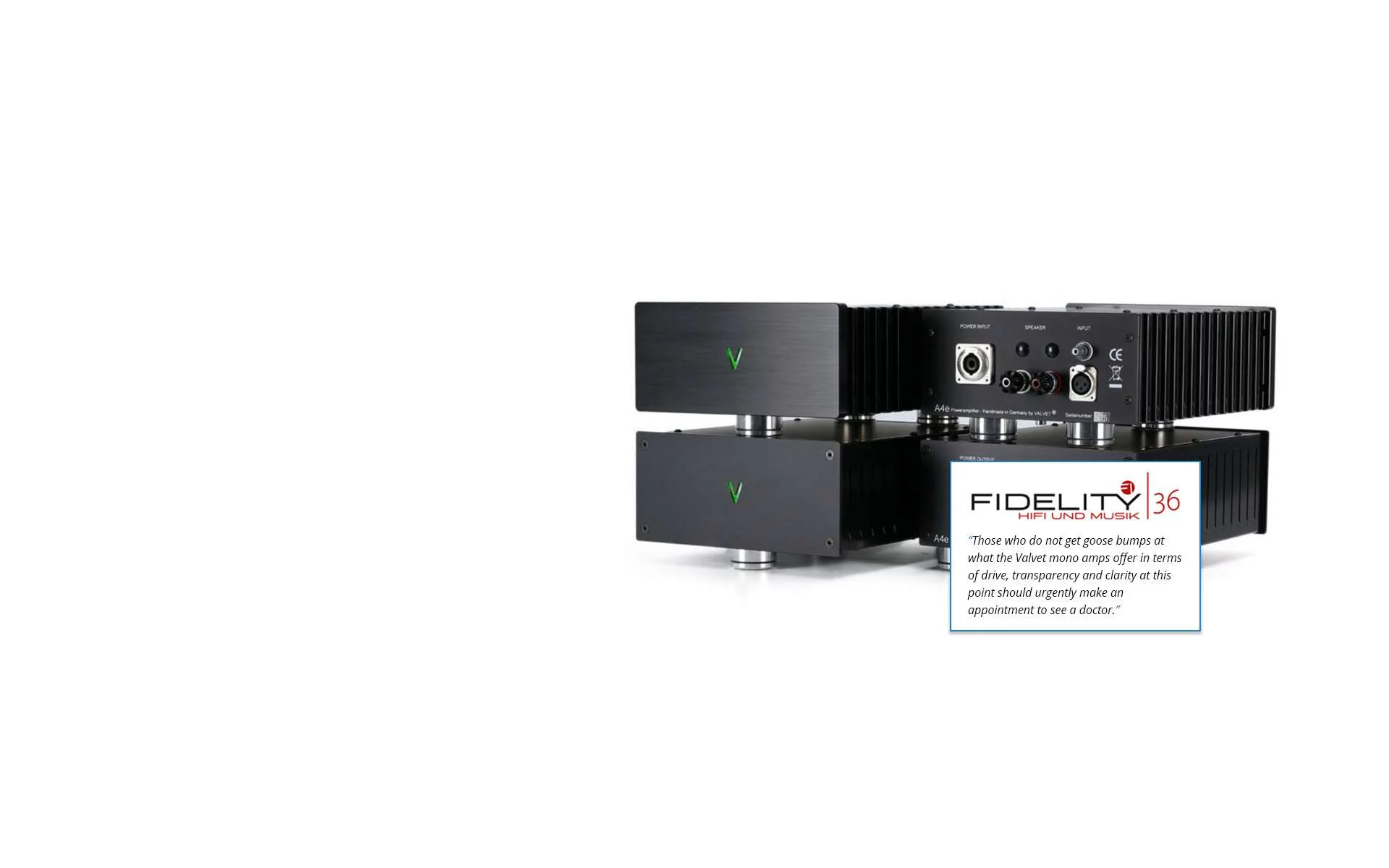 und großartig klingend."Erfahren Sie mehr Testbericht über die VALVET Röhrenvorstufe soulshine2MKII im Magazin „HÖRERLEBNIS“Erfahren Sie mehr Highlight: Top Review über unsere E3in der Ausgabe 06/21 der FIDELITYErfahren Sie mehr Fidelity Award 2020 für unsere A4ein der Kategorie EndverstärkerErfahren Sie mehr StereoTimes Most Wanted Component of the Decade Awardfür unsere A4eErfahren Sie mehr Testbericht für unsere E2in der Ausgabe 10-2018 der STEREOPLAYZu den Presseberichten Gelobt in hohen Tönenvon renommierten FachmagazinenErfahren Sie mehr FIDELITY AWARD für unsere A4 Monoblöcke„V wie vorzüglich, voll gut oder einfach VALVET."Erfahren Sie mehr High End Verstärkervon ValvetJetzt Lesen Testbericht VALVET Endstufe A4.5in der "FIDELITY", Ausgabe 73 03/2024Jetzt Lesen Testbericht VALVET Endstufe A4.5in der "FIDELITY", Ausgabe 73 03/2024